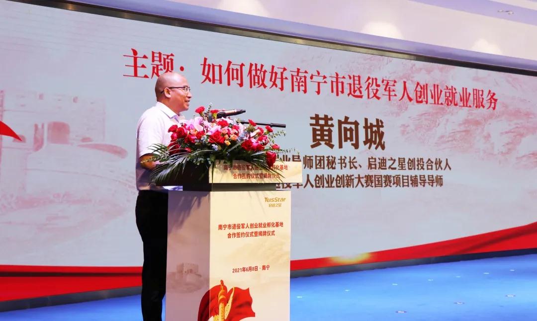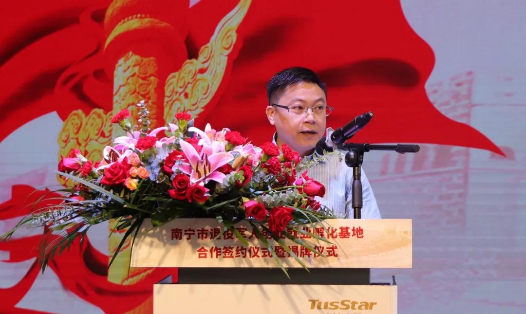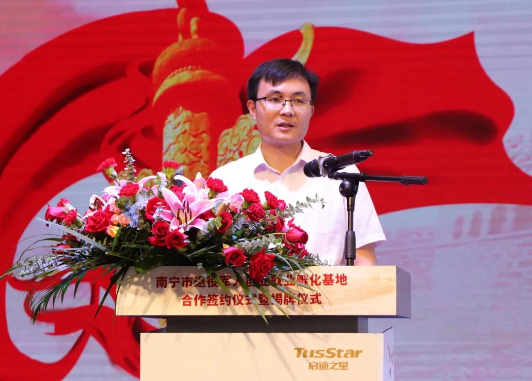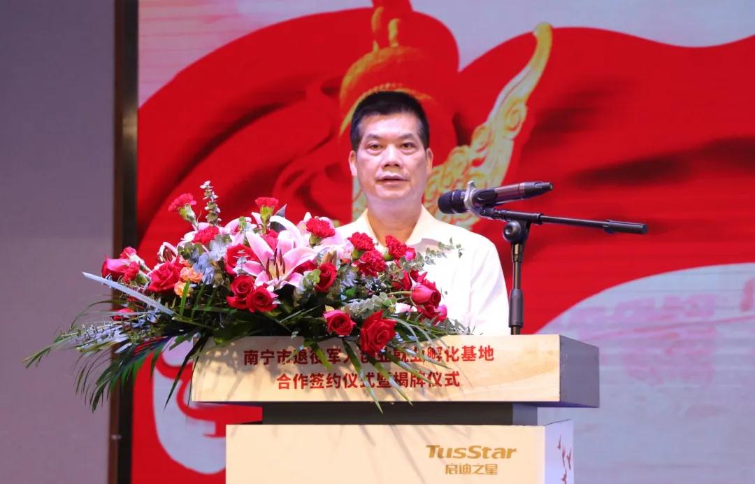 廣西啟迪科技城集團副總裁覃樹(shù)寧主持儀式,南寧市退役軍人事務(wù)局黨組書(shū)記、局長(cháng)陳欣善,啟迪之星(北京)科技企業(yè)孵化器有限公司副總經(jīng)理、山東啟迪軍創(chuàng )科技服務(wù)有限公司總經(jīng)理曹萌分別致辭。