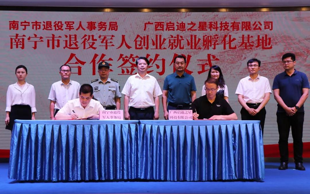 在與會(huì )領(lǐng)導的見(jiàn)證下,南寧市退役軍人事務(wù)局黨組書(shū)記、局長(cháng)陳欣善與廣西啟迪之星科技有限公司執行總經(jīng)理方志明簽署《南寧市退役軍人創(chuàng )業(yè)就業(yè)孵化基地合作共建協(xié)議》。