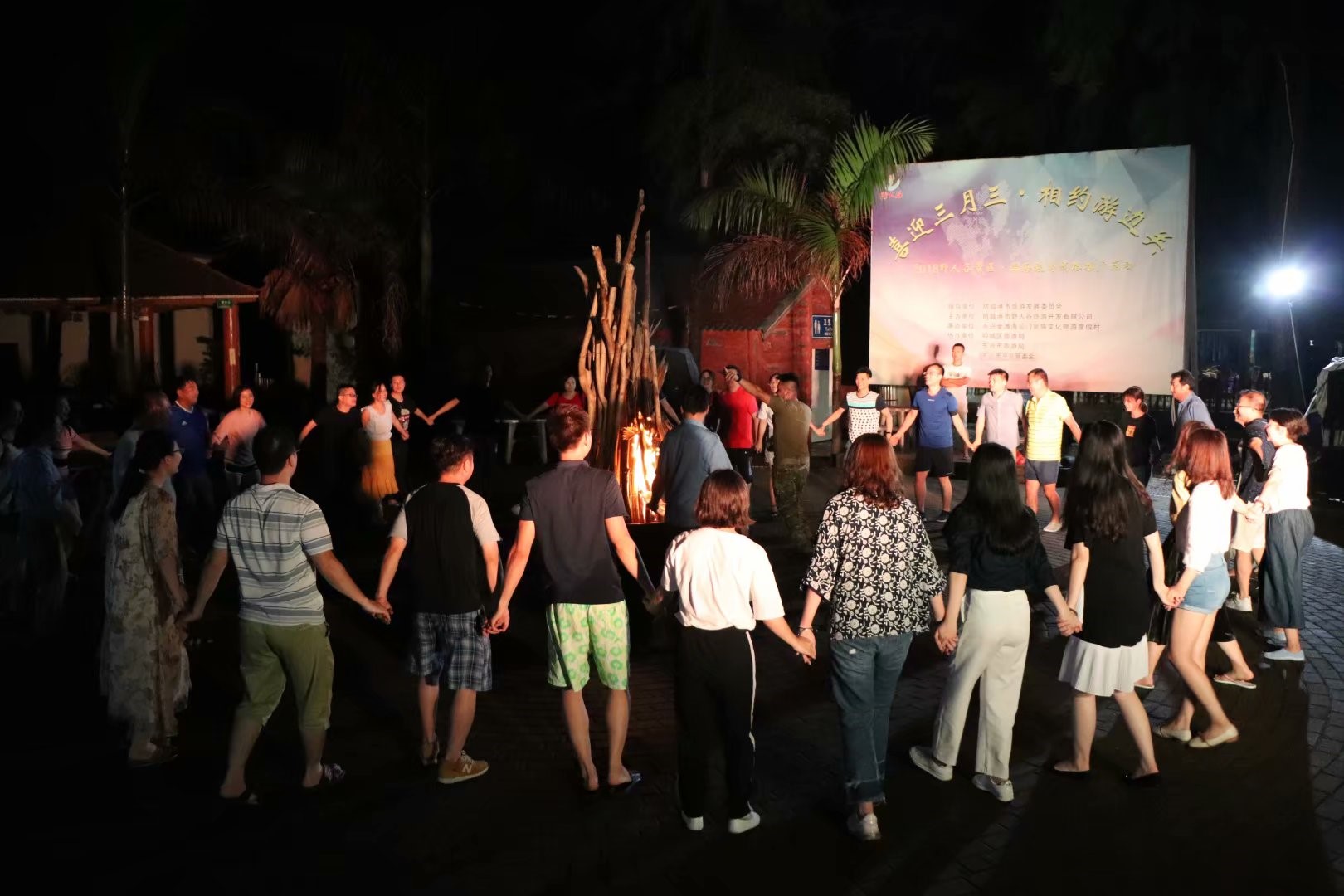 公司幾位領(lǐng)導手持火把點(diǎn)燃木材,熊熊大火沖天而上。圍著(zhù)篝火,幾十人手牽手、肩并肩玩起游戲,跳起舞蹈。在大火的炙熱中,每個(gè)人汗如雨下,歌聲、笑聲、歡樂(lè )聲不絕于耳。